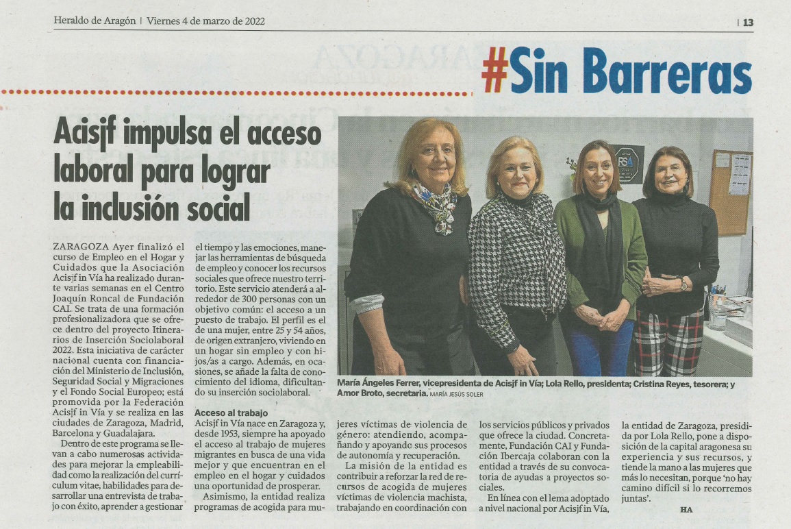 El diario recogió la labor de ACISJF IN VIA Zaragoza en la mejora del acceso laboral de mujeres migrantes en riesgo de exclusión, destacando nuestros programas de formación y acompañamiento para favorecer la inclusión social.